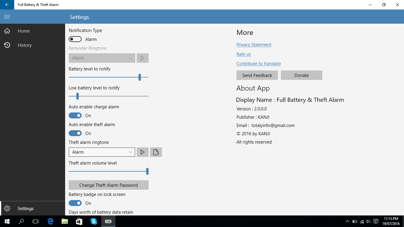 Different types of notifications when the battery is fully charged when the battery is low. Unplug your laptop to make the sound stop. Display battery status on live tiles. Display battery status on live tiles.