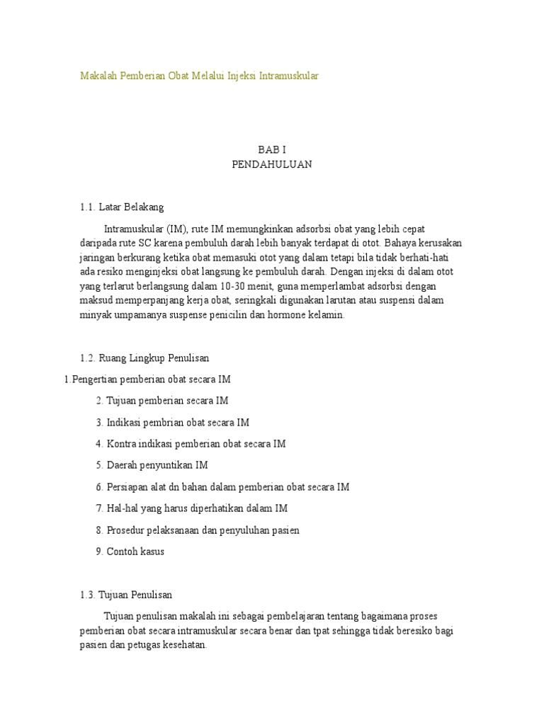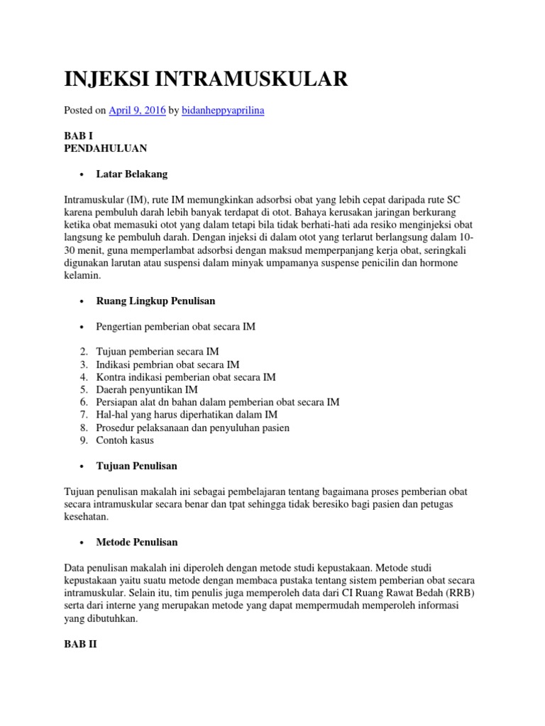 Bab i pendahuluan latar belakang intramuskular im rute im memungkinkan adsorbsi obat yang lebih cepat daripada rute sc karena pembuluh darah lebih banyak terdapat di otot. Pengertian injeksi intravena pemberian obat dengan cara memasukkan obat ke dalam pembuluh darah vena dengan menggunakan spuit. Kapas alkohol dalam kom secukupnya perlak dan pengalas. 25 27 g dan panjang 1 inci untuk anak anak bak spuit 1.