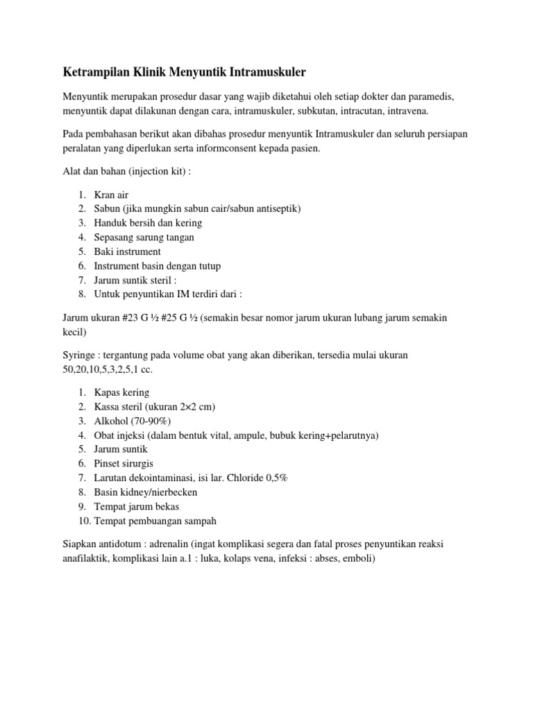 Alat dan bahan injeksi intramuskular. Berikut ini penjelasan mengenai injeksi intravena iv definisi kegunaan indikasi kontraindikasi tempat sop kelebihan dan kekurangan injeksi intra vena iv reaksi 15 detik 15 menit a. Spuit dengan ukuran sesuai kebutuhan. Dan pemberian obat melaului injeksi intra muskuler ini harus tepat dengan 6. Sarung tangan 1 pasang.