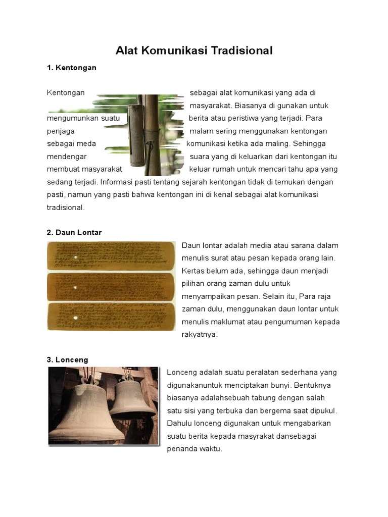 Dahulu lonceng digunakan untuk mengabarkan suatu berita kepada masyrakat dansebagai. Batang pohon tersebut dilubangi sedemikian rupa lalu cara menggunakannya dengan dipukul untuk menghasilkan suara. Kentongan juga identik dengan orang yang tinggal di kawasan pegunungan atau pedesaan yang masih hidup dengan cara tradisional yang sederhana. Komunikasi tradisional adalah proses penyampaian pesan dari satu pihak ke pihak lain dengan menggunakan media tradisional yang sudah lama digunakan di suatu tempat sebelum kebudayaannya tersentuh oleh teknologi modern pada zaman dahulu komunikasi tradisional dilakukan oleh masyarakat primitif dengan cara yang sederhana.
