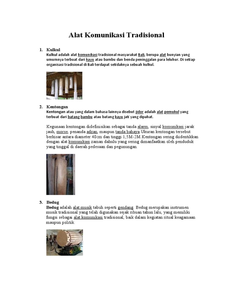 Alat komunikasi tradisional bedug. Selain dipakai untuk menandakan terjadi sesuatu yang darurat kentongan juga biasanya dipakai untuk membangunkan orang ketika menjelang bersahur pada bulan. Alat komunikasi tradisional ini dulunya menjadi semacam sirine pemberitahuan dan darurat yang sangat diandalkan. Bedug tidak hanya dipakai di indonesia di jepang misalnya alat tradisional semacam bedug juga ada dan dinamai wakaido.