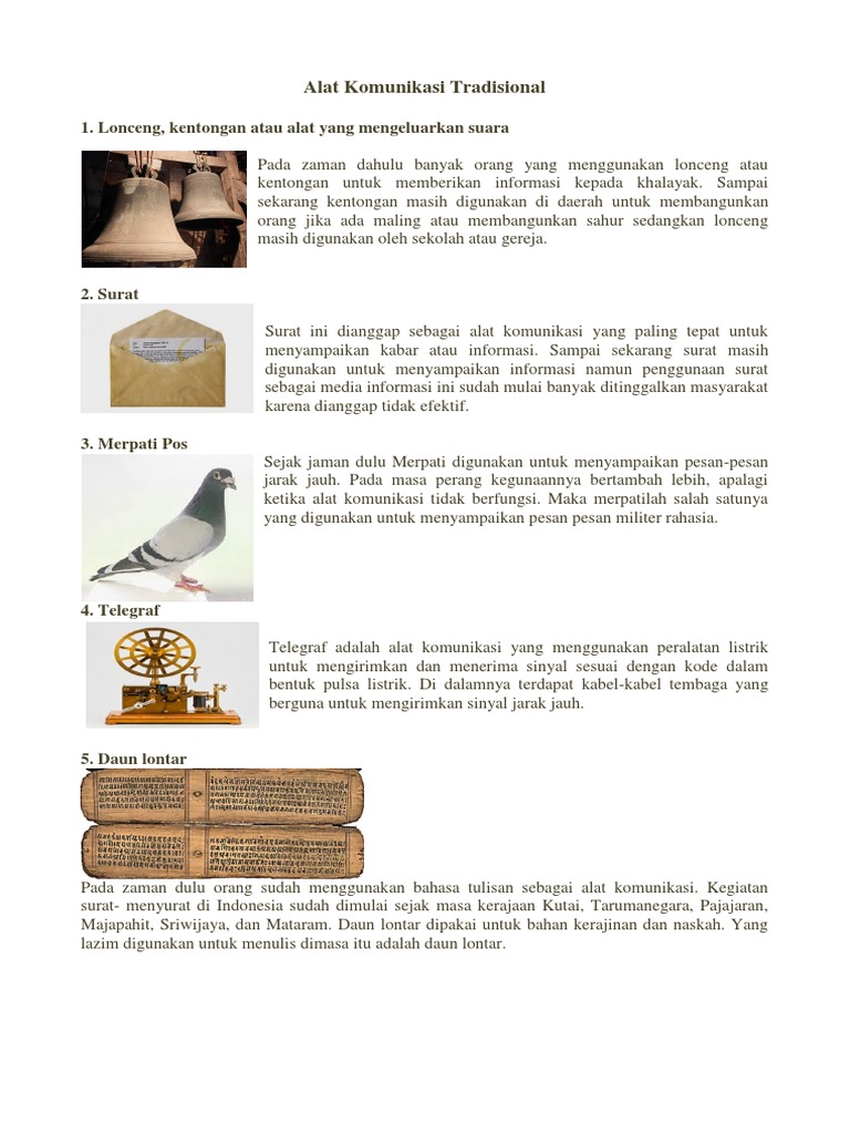 Alat komunikasi tradisional pada masa lalu adalah. Media cetak adalah alat komunikasi yang dicetak di atas kertas misalnya. Surat surat kabar majalah e mail dan telegram. Berikut adalah media komunikasi yang digunakan pada masa lalu. Peralatannya pun masih menggunakan bahan bahan alam seperti daun lontar kentongan dan asap.