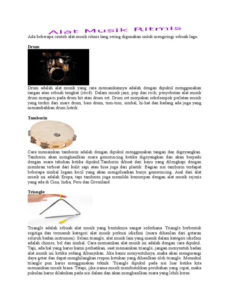 Meskipun nggak ada nadanya alat musik ritmis sangat berguna lho. Beberapa contoh alat musik ini misalnya drum marakas simbal tamborin timpani triangle konga timpani kastanyet rebana tifa dan kendang. Alat musik ritmis ini memiliki peranan yang sangat penting dalam mengatur sebuah irama pada lagu sehingga bisa nyaman untuk dibuat dan di nikmati.