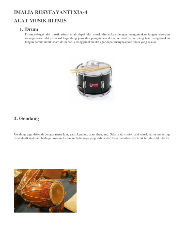 Alat musik ritmis yaitu. Menurut fungsinya alat musik dibagi menjadi 3 yaitu ritmis melodis dan harmonis. Sudah sejak lama mulai zaman dahulu hingga zaman modern sekarang ini musik menjadi pelengkap hidup manusia. Selain itu alat musik ritmis juga memiliki fungsi yang lain yaitu sebagai pengatur irama atau tempo lagu. Alat musik melodis harmonis dan juga ritmis.