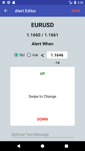 Forex price alarm app. Real time forex rates update. Price alert fast exactly. Swipe gestures are used to adjust price levels quickly and easily. With forex alarm investing on forex market will be easier.
