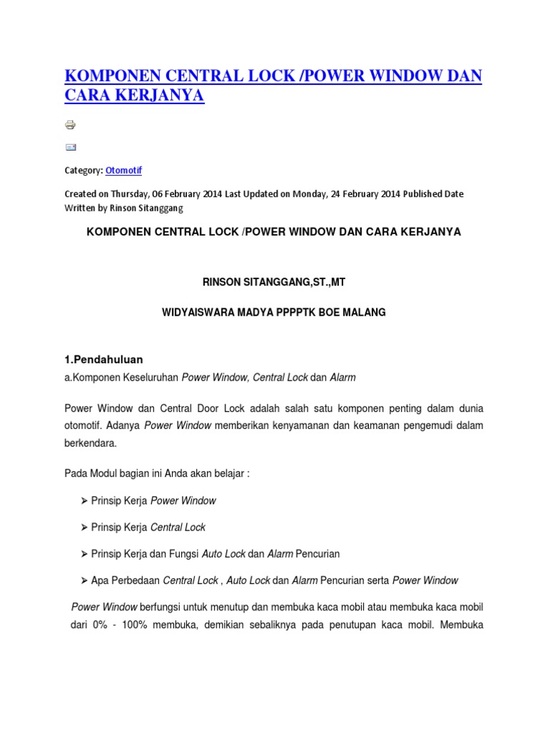 Terasa suatu kepuasan yang sukar unutuk dinyatakan. A tranter automobile electrical electronic systems 2. Berisi rangkaian elektronik yang mengatur agar lock actuator hanya bekerja diberi tegangan listrik hanya sekitar 1 2detik saja untuk membuka atau menutup. Central lock module adalah unit utama yang mengatur mengontrol seluruh lock actuator.